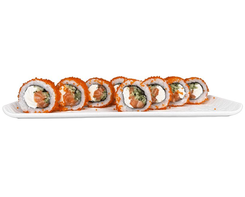 Рис, свіжий лосось, натуральна ікра тобіко, огірок, крем сир Філадельфія, норі