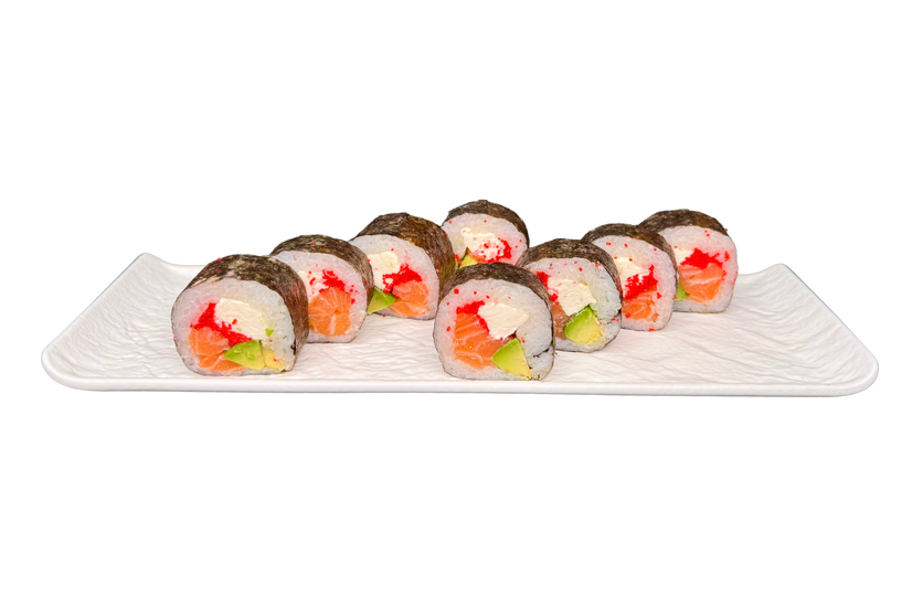 Рис, норі, свіжий лосось, крем сир, авокадо, ікра летючої риби