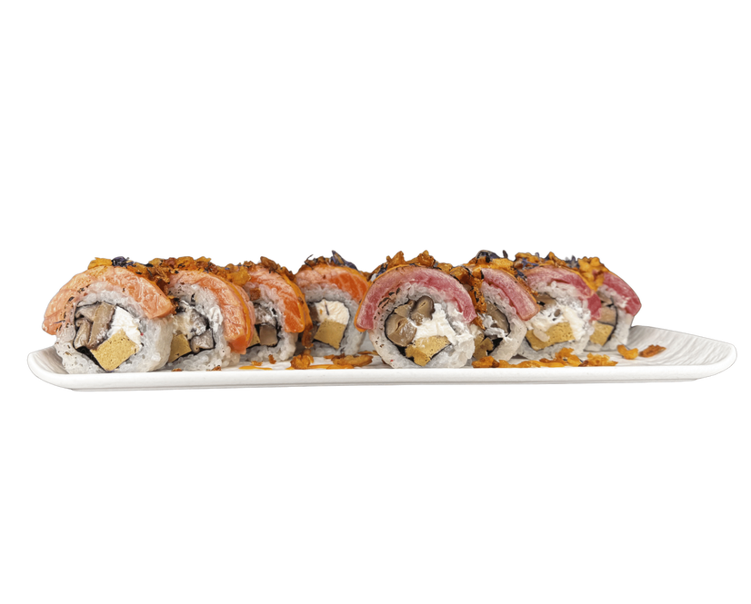 Лосось/ тунець гриль, гриби Шиїтаке, крем сир Філадельфія, соус Спайсі, кранч цибуля, японський омлет Тамаго