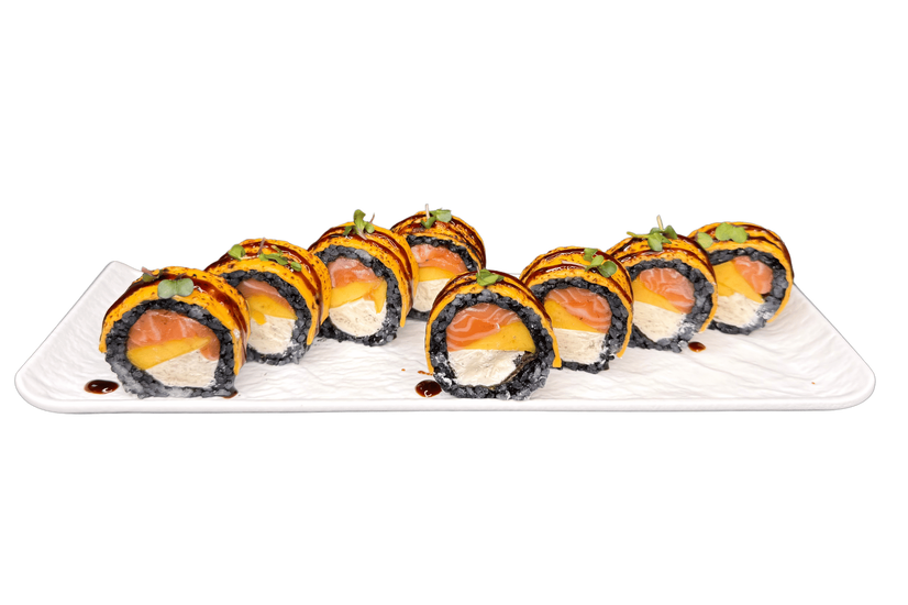 Рис, лосось, ніжний крем сир філадельфія, манго, сир чеддер, поливається солодкуватим соусом унагі та прикрашається мікрогріном