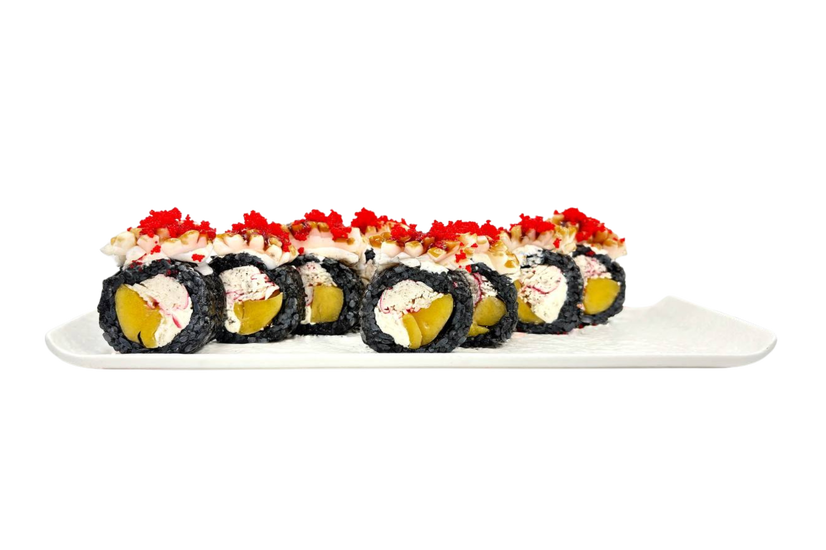 Квітка кальмара, рис, чорнило каракатиці, манго, сніговий краб, крем сир, ікра