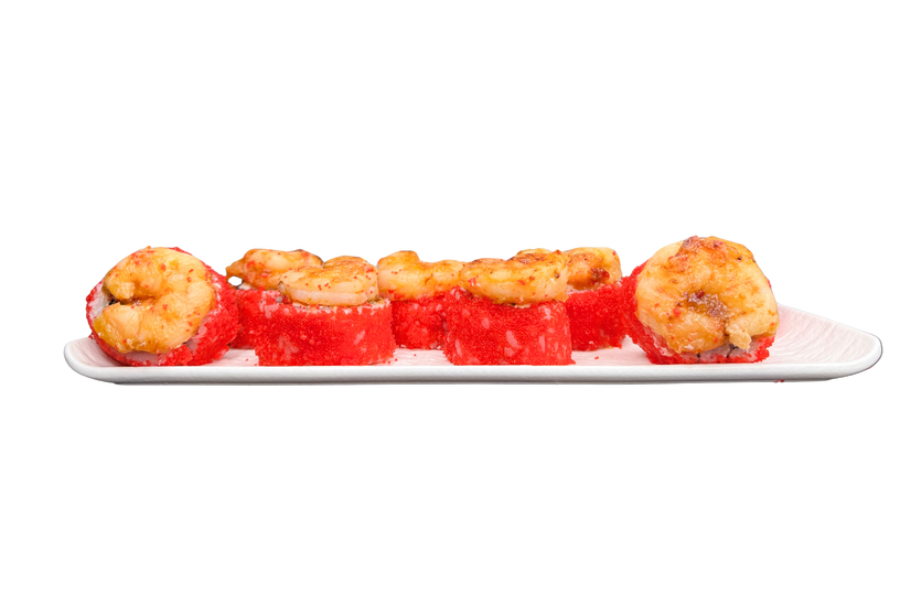 Тигрові креветки смажені, рис, крем сир Філадельфія, сніговий краб, огірок