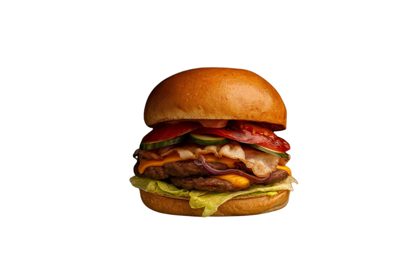 Булка Бріош, бекон, дві яловичих котлети, чедер, свіжий огірок, соус для бургеру, помідор, цибуля Ялтинська