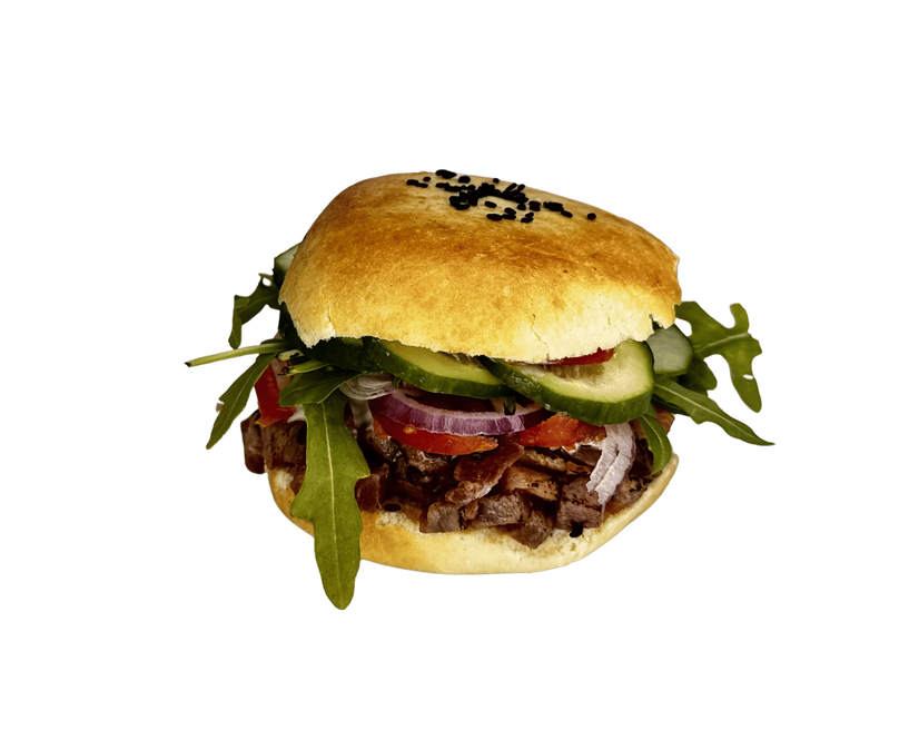 Смажений тунець, рукола, огірок, помідор, гірчиця, сир чедер, цибуля Ялтинська, соуси, булочка BAO