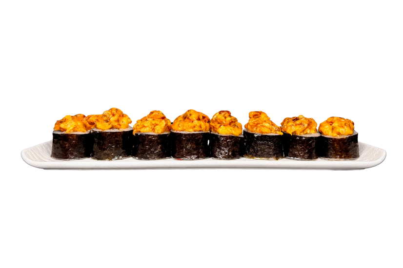 Рис, вугор смажений, сир чеддер, крем сир філадельфія, японський омлет тамаго, норі, соус спайсі (середньої гостроти)