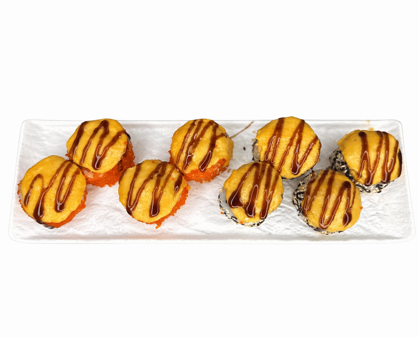 Смажений лосось в соусі Теріякі, ніжний крем сир Філадельфія, японський омлет Тамаго, натуральна ікра Тобіко, кунжут, рис, норі (поливається солодким соусом Унагі та Спайсі (гоструватим)