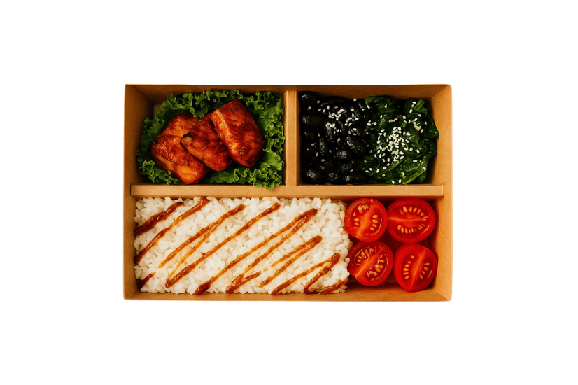 Рисові кульки, смажений лосось, соус Унагі, чері, салат Чука, Муєр деревний гриб