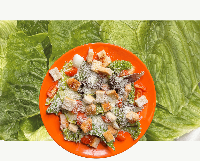 Мікс салатів (рамен, айсберг), перепелині яйця, пармезан, сухарики, фірмовий соус Цезар, чері, на вибір куряче філе/слабосолений лосось/тигрові креветки обсмажені