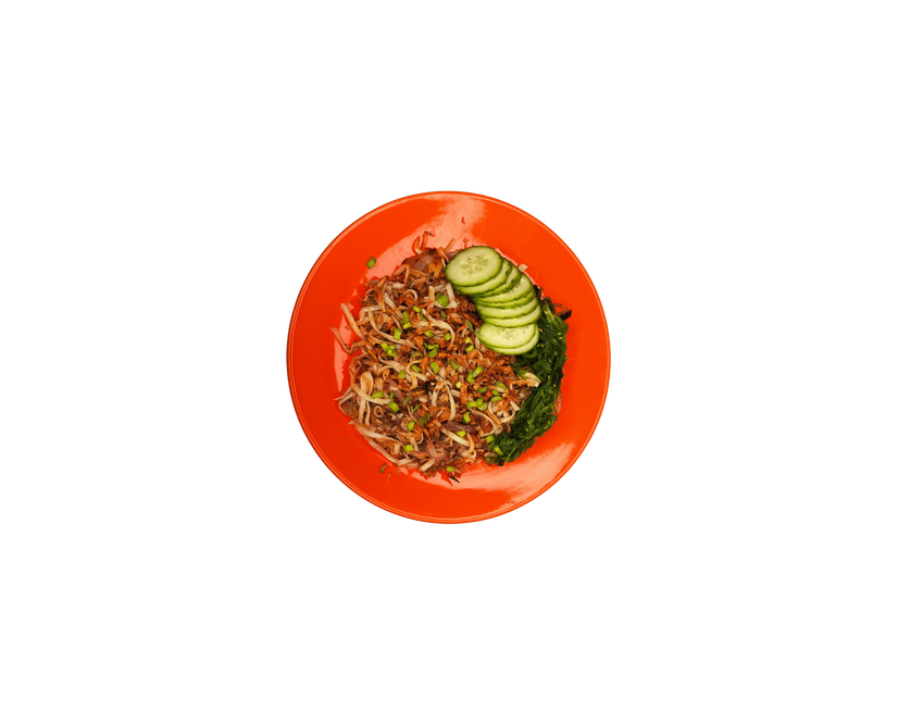 Локшина пшенична, рвана свинина, цибуля Марс, огірок, чука, цибуля зелена, цибуля кранч, азійські соуси