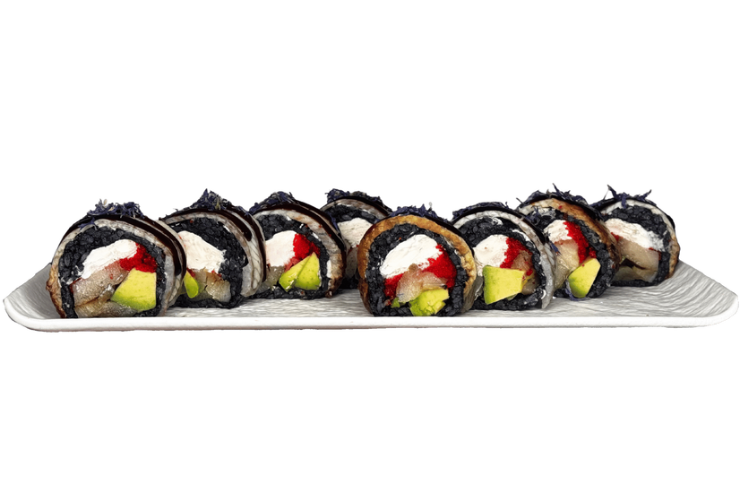 Рис, чорнило каракатиці, смажений вугор, копчена масляна, авокадо, ікра, крем-сир, норі, соус Унагі