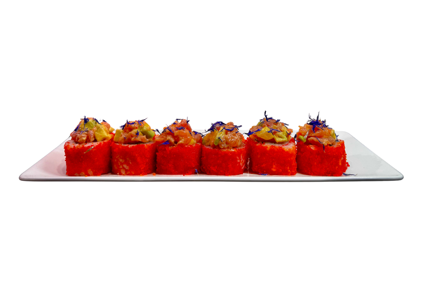 Рис, лосось охолоджений, тунець охолоджений, манго, авокадо, ікра, соус , огірок, японський омлет Тамаго