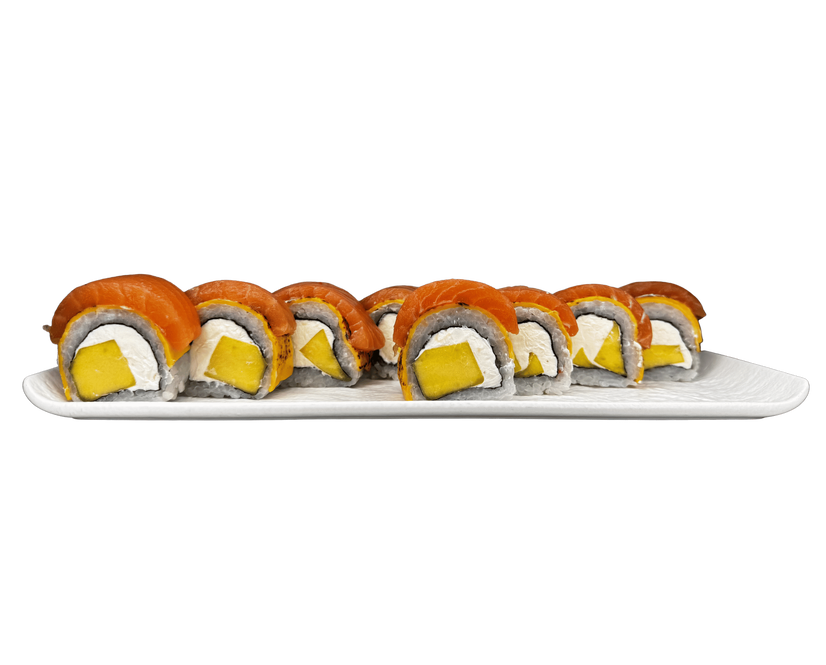 Слабосолений лосось, манго, крем сир, сир чедер, рис
