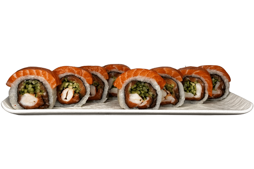 MAXI порція охолодженого лосося, хрусткий огірок, тигрові креветки, рис, норі