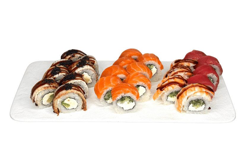 Філадельфія комбо з тигровою креветкою та тунцем (рис, огірок, солодкуватий крем сир, тунець, тигрова креветка) поливається соусом унагі