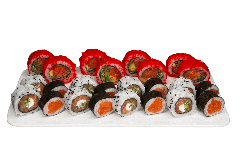 Каліфорнія з лососем (авокадо, огірок, лосось MAXI порція, ікра)