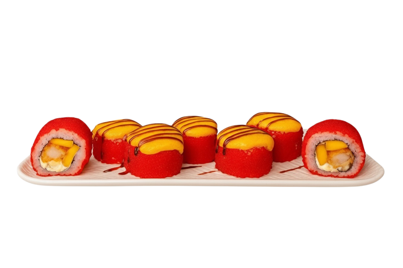 Рис, хрусткі тигрові креветки темпура, солодкий манго, крем сир