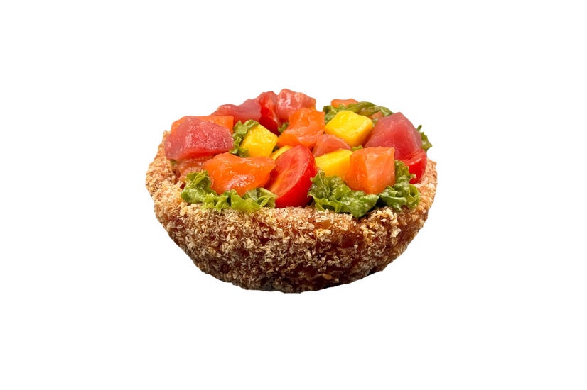 Хрустка тарілка з рису, охолоджений лосось, тунець, чері, салат, манго